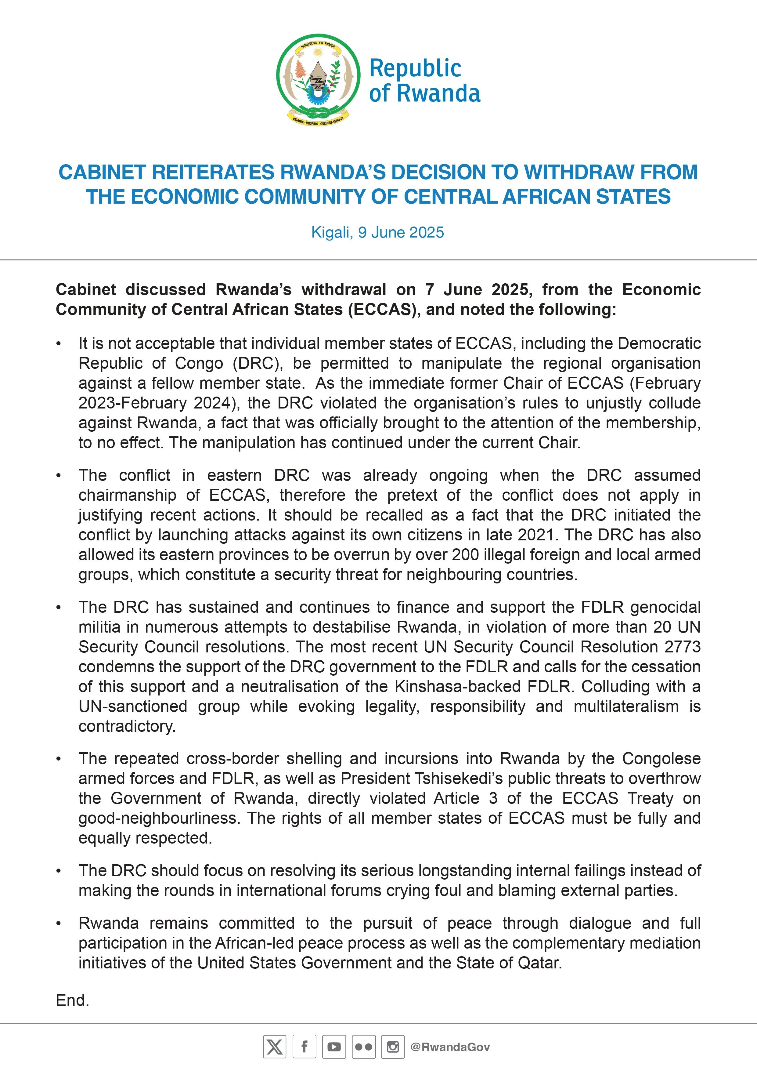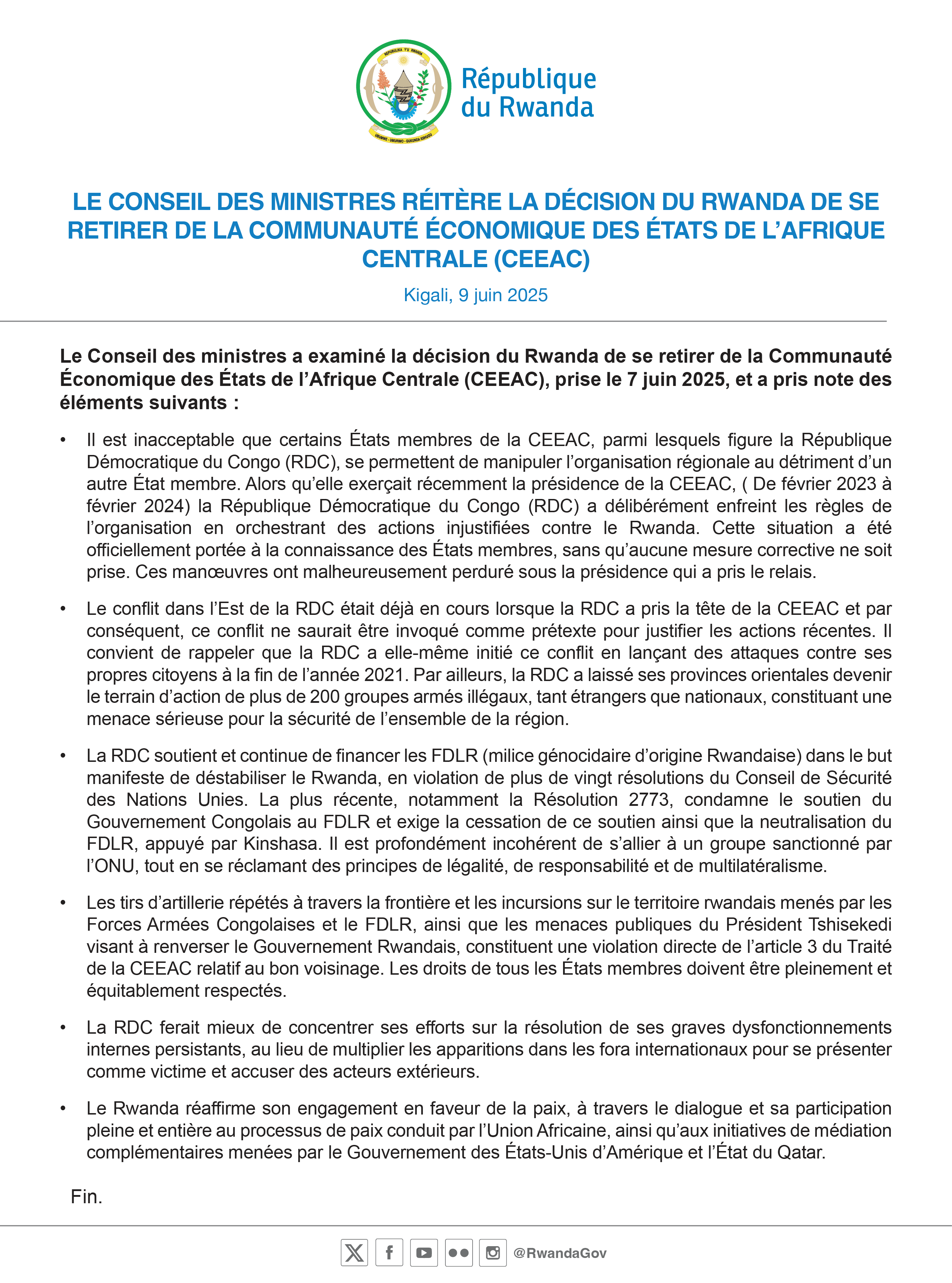 Le Conseil des ministres a examiné la décision du Rwanda de se retirer de la Communauté Économique des États de l'Afrique Centrale (CEEAC), prise le 7…