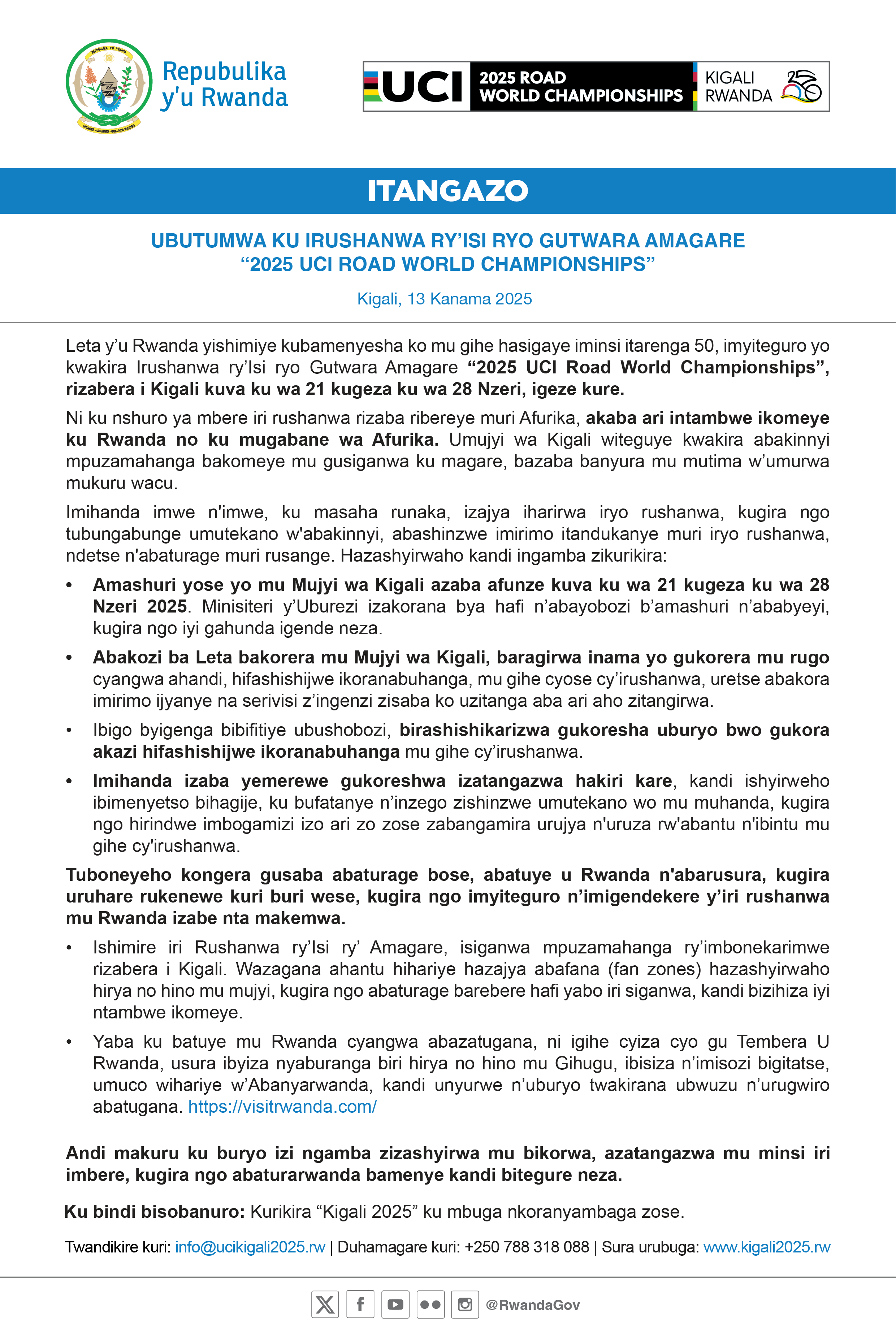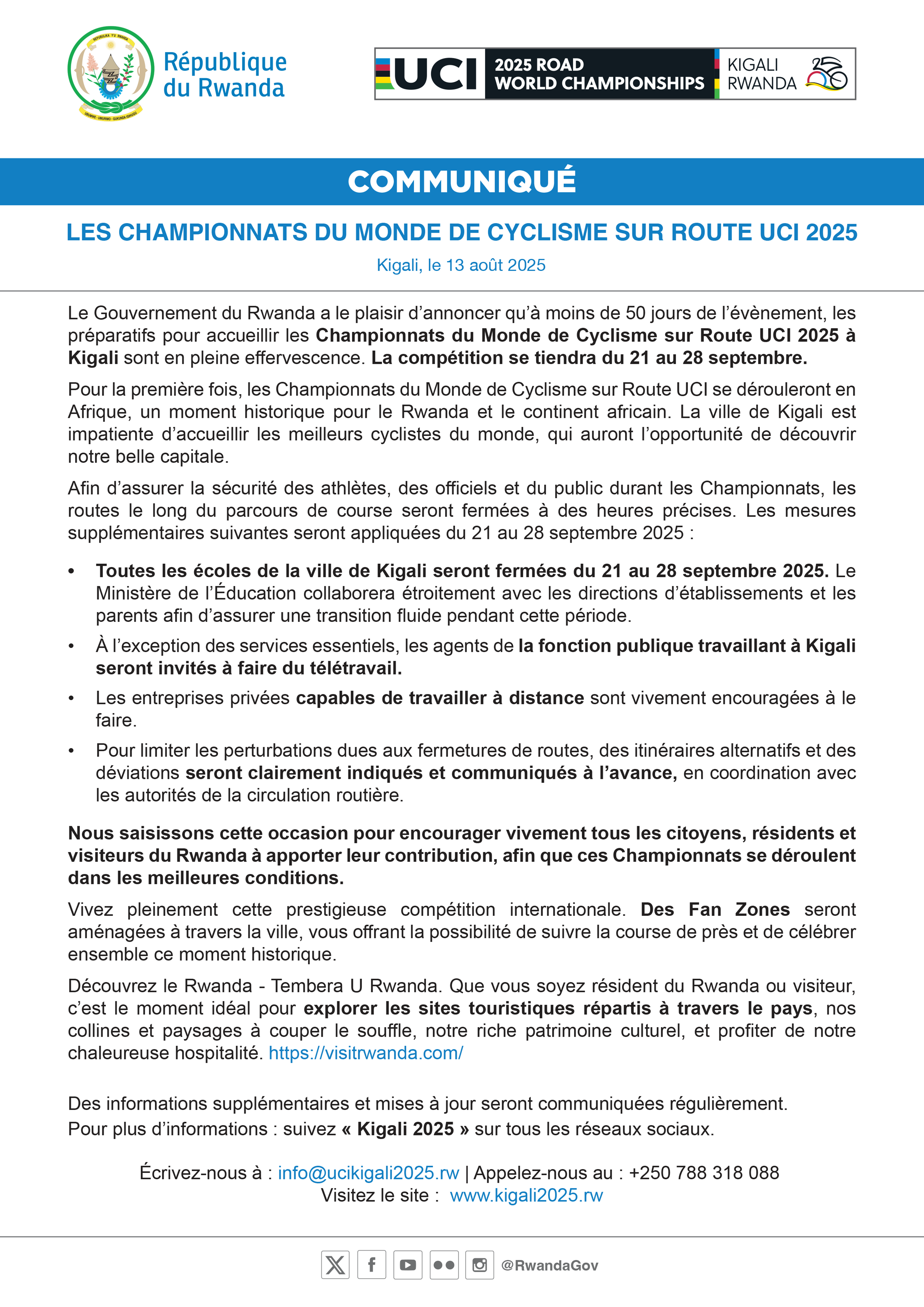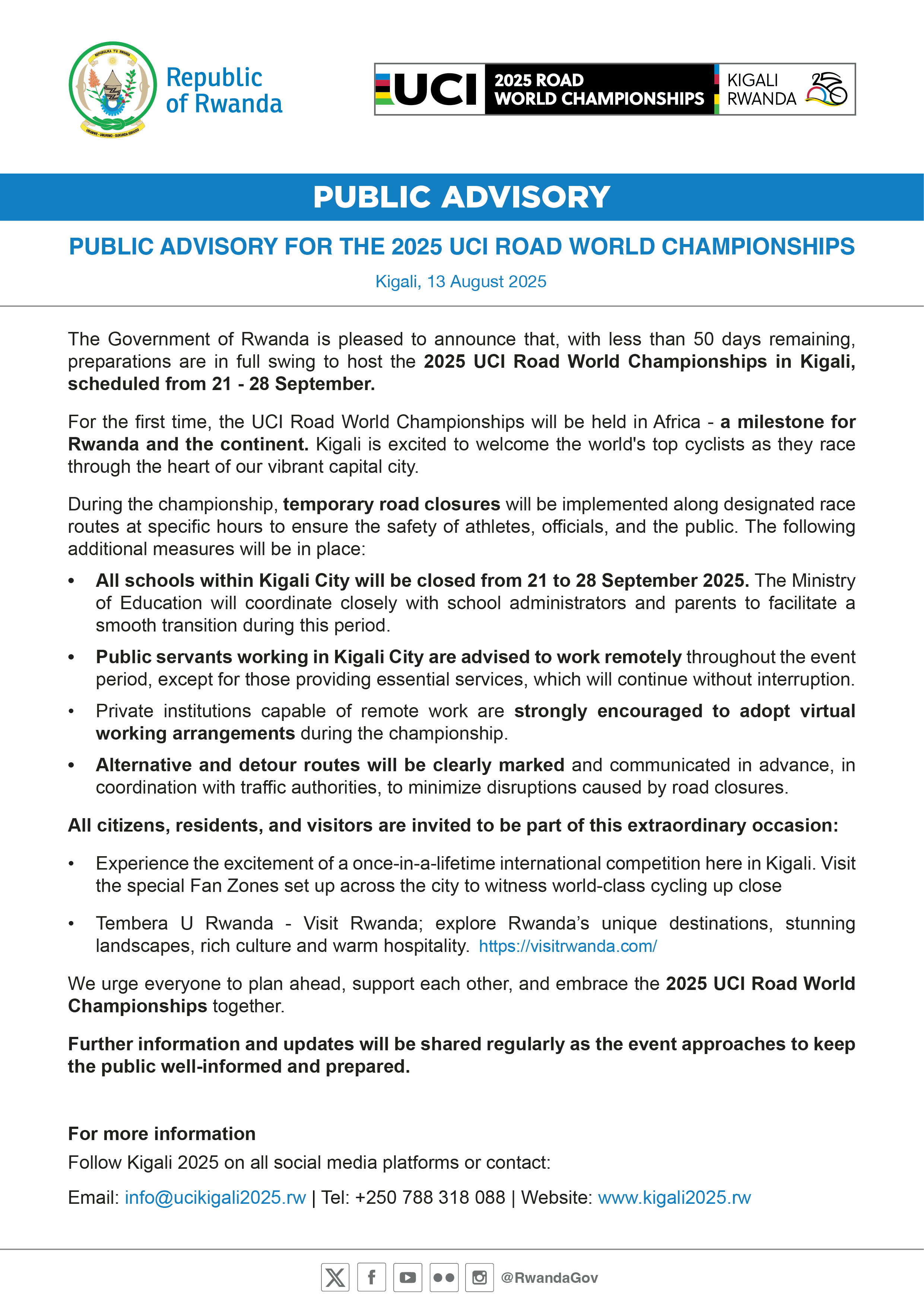 The Government of Rwanda is pleased to announce that, with less than 50 days remaining, preparations are in full swing to host the 2025 UCI Road World…